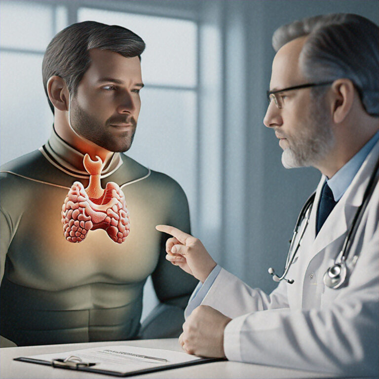 Excesso de produção de hormônios tireoidianos, causando perda de peso, palpitações, ansiedade e aumento da sudorese. O tratamento pode incluir medicamentos, terapia com iodo radioativo ou cirurgia.